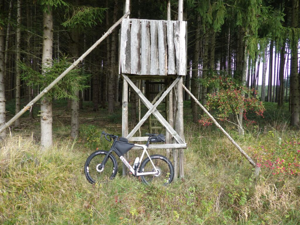 Dann kam der Moment, der diese Tour besonders machte: Ich wollte ein paar Fotos meiner neuen Satteltasche – der „Arschrakete“ – machen und fuhr dafür ein kurzes Stück über eine scheinbar harmlose Wiese, um am Waldrand den besten Blick zu erwischen. Kaum angehalten, tauchte ein Jäger auf. Kein grimmiger Mahner, sondern ein freundlich nickender Mann mit wachen Augen.